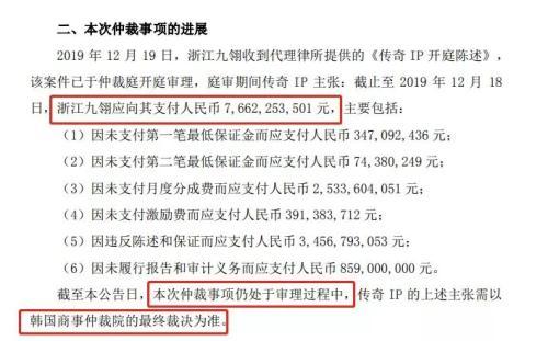 2018年12月20日,恺英网络披露公告,浙江九翎收到韩国商事仲裁院送达的《仲裁申请》。传奇IP认为浙江九翎未能根据《许可协议》的约定支付最低保证金(部分)、月度分成款和一次性奖励金等共计约人民币1.71亿元。