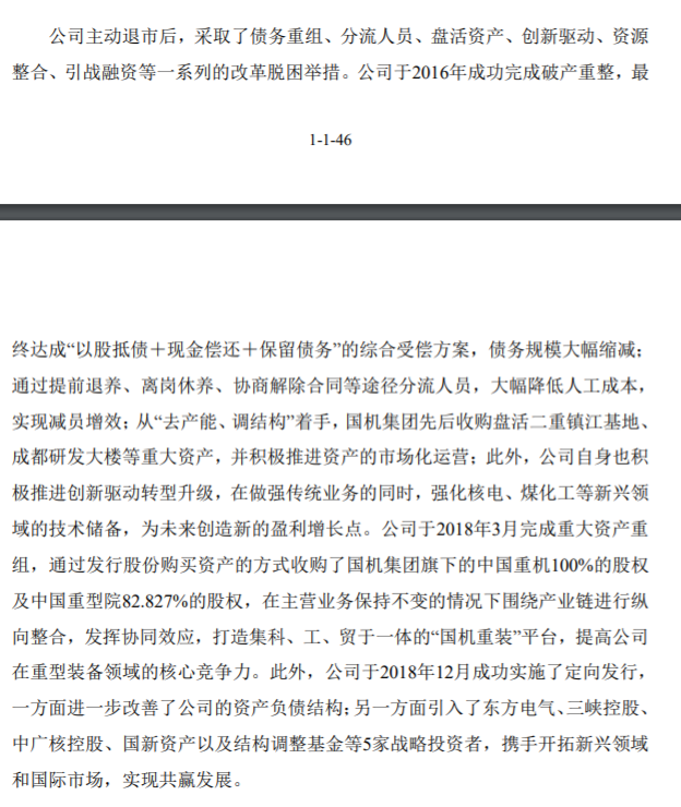 根据公司5月29日晚发布的《重新上市申请书》(简称《申请书》),公司主动退市后,采取了债务重组、分流人员、盘活资产、创新驱动、资源整合、引战融资等一系列的改革脱困举措。公司于2018年3月完成重大资产重组,通过发行股份购买资产的方式收购了国机集团旗下的中国重机100%的股权及中国重型院82.83%的股权,在主营业务保持不变的情况下围绕产业链进行纵向整合,发挥协同效应,打造集科、工、贸于一体的“国机重装”平台,提高公司在重型装备领域的核心竞争力。