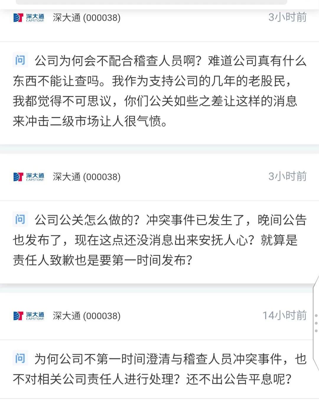 针对深大通相关工作人员的一系列奇葩表现,投资者在股吧和互动易上也纷纷表达了对公司暴力抗法行为的愤慨和谴责,还有部分投资者对于公司相关责任人迟迟没有出面道歉及说明情况表示不解。