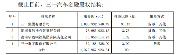 公告称,三一汽车金融于2010年10月获中国银监会批准开业,是全国25家汽车金融公司之一。