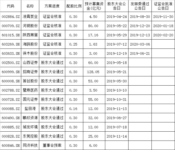 统计显示,目前还有15家上市公司在配股路上,其中凌霄泵业、河钢股份、陕西黑猫已经拿到配股批文,另外徕木股份、海鸥股份也已经过发审会,还有多家公司配股获股东大会通过或董事会通过。
