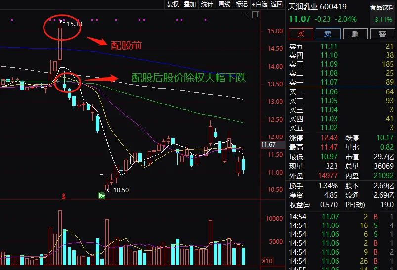 今年1月配股的天润乳乳业,配股日期也是1月6日-1月10日,天润乳业停牌前股价为15.1元/股,配股价为7.24元/股,配股比例为每10股配3股。配股后除权价=(10*15.1+3*7.24)/13=13.29元/股,较停牌前的15.1元股价,股价降低11.99%。