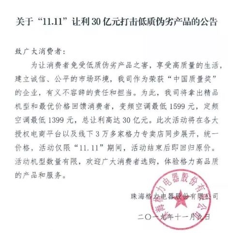 11月10日,格力电器官微公告,格力电器“11.11”期间让利30亿元,打击低质伪劣产品,变频空调、定频空调最低价分别至1599、1399元。