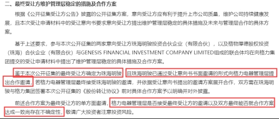 公告还提到,目前珠海明骏已通过受让意向书书面邀请的形式向格力电器管理层提出合作邀请。
