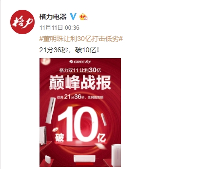 在15秒全网销售破亿之后,格力电器半个小时后又官宣,21分36秒,全网销售破10亿。