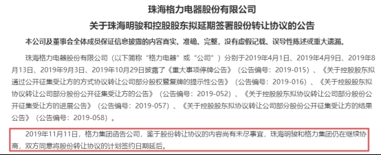 11月11日晚间,格力电器发布公告称,鉴于股份转让协议的内容尚有未尽事宜,珠海明骏和格力集团仍在继续协商,双方同意将股份转让协议的计划签约日期延后。