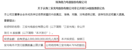 根据公告,格力电器拟以自有资金20亿元认购三安光电非公开发行的股份。按三安光电此次发行股数上限计算,格力电器完成这笔投资后,将持有三安光电4.76%的股份。