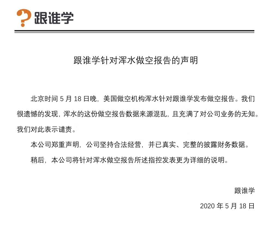 经历多次做空的跟谁学(GSX.US)5月18日再度遭遇浑水阻击。北京时间18日晚间,浑水称跟谁学至少虚构了80%营收,正在做空跟谁学,这已经是浑水公司第三次出手做空教育中概股,也是跟谁学收到的第五份机构做空报告。此前香橼的两次做空跟谁学,但并未造成太大伤害。