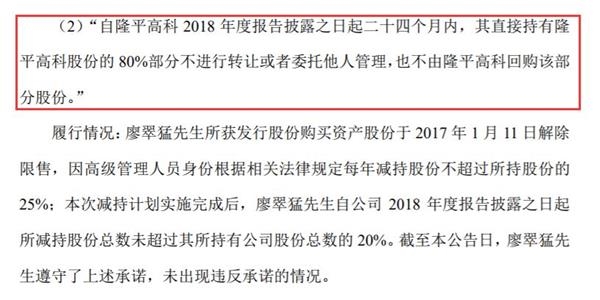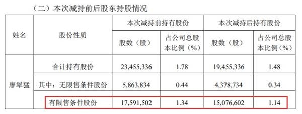公告显示,廖翠猛所获发行股份购买资产股份于2017年1月11日解除限售,因高级管理人员身份根据相关法律规定每年减持股份不超过所持股份的25%;上述减持计划实施完成后,廖翠猛自公司2018年度报告披露之日起所减持股份总数未超过其所持有公司股份总数的20%。