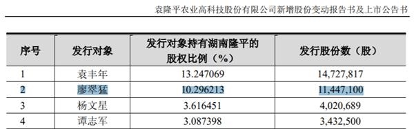 彼时发行价格为20元/股,廖翠猛获得隆平高科股份1144.71万股。后因“10转10”及2015年增持,廖翠猛持股数量增至2345.53万股。
