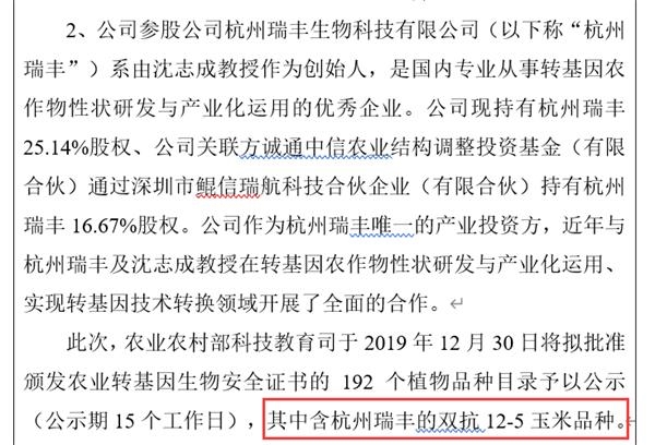 2019年12月30日,农业农村部科技教育司公告称,拟批准颁发192个植物品种的转基因安全证书,其中包括大北农的转基因玉米“DBN 9936”、杭州瑞丰/浙江大学的转基因玉米“双抗12-5”。杭州瑞丰系隆平高科参股公司。