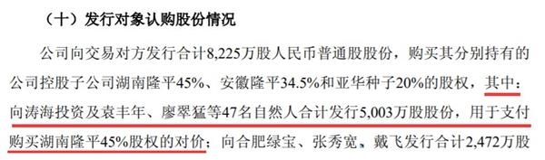 廖翠猛的股份系上市公司发行股份购买资产时所获。隆平高科2014年1月披露的《新增股份变动报告及上市公告书》提到,公司向涛海投资及袁丰年、廖翠猛等47名自然人合计发行5003万股股份,用于支付购买公司控股子公司湖南隆平45%股权的对价。
