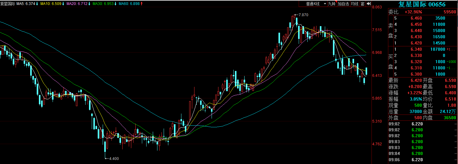 今日,复星国际开盘涨近6%,随后有所回落,截至发稿,报6.42港元,涨3.22%。