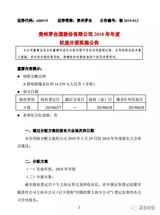 6月22日,贵州茅台发布2018年年度权益分派实施公告。