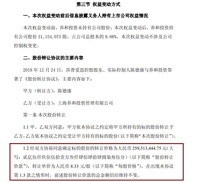 2018年12月24日,陈德康就将其持有的9.66%股份转让给养和投资,转让单价为每股8.33元,总价约2.6亿元。此次再转让2336.56万股,转让价格确定为17.80元/股,交易对价合计为4.16亿元,共分三期付清,最后一期在公司发布改选董事会和监事会的会议通知后,有关董事会和监事会会议召开前付清款项。