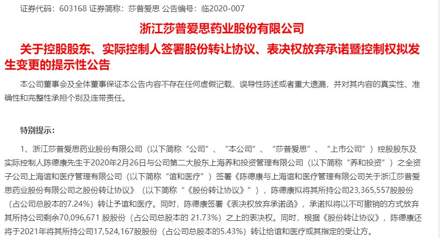 2月26日,莎普爱思公告称,公司控股股东及实控人陈德康签署股份转让协议及表决权放弃承诺函,将其所持公司2336.56万股股份(占公司总股本的7.24%)转让给公司第二大股东上海养和投资管理有限公司(简称“养和投资”)方面。