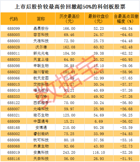 华兴源创最新价较最高价回撤49.83%,科创板不少个股也出现类似情况。证券时报·数据宝统计显示,科创板股票较高点回撤50%的个股,共有22只。