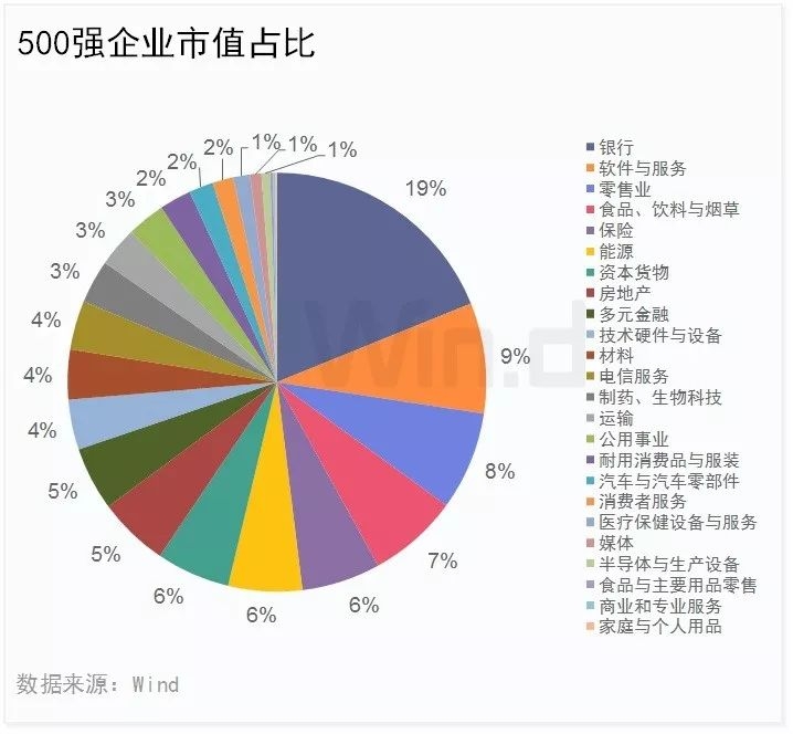 银行业市值占比最高,达19%;其次是软件与服务、零售业,占比分别为9%和8%。