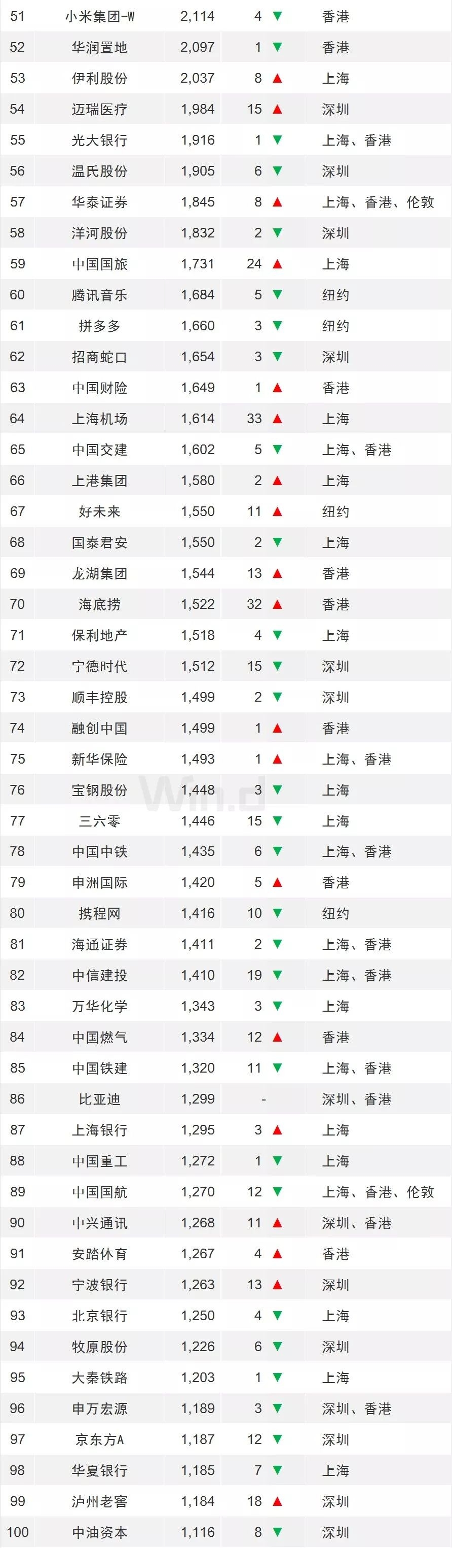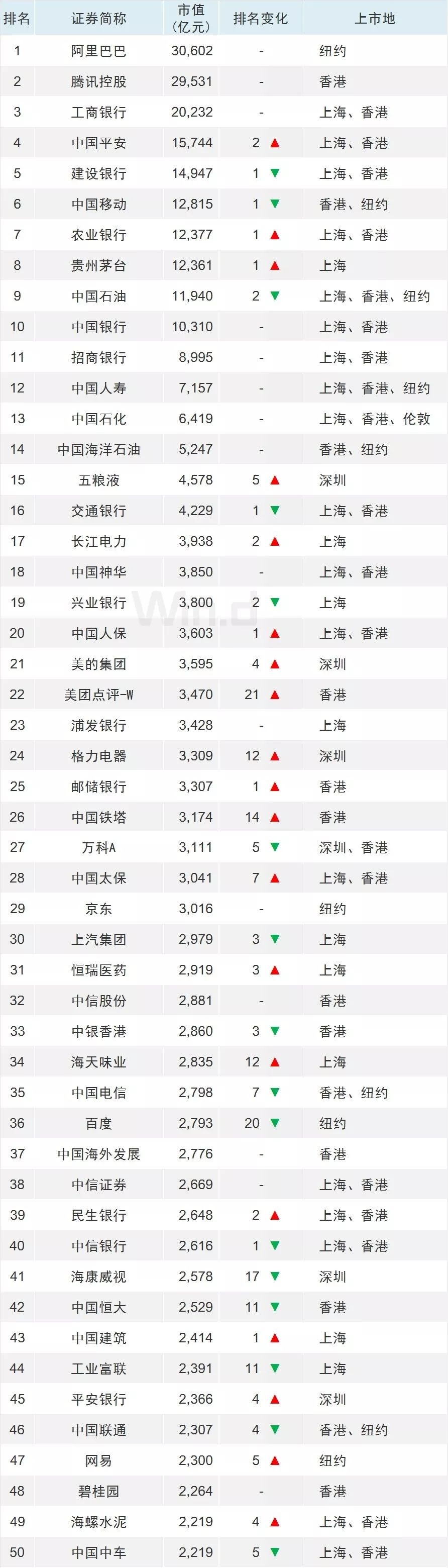 相比2019年一季度末,前10名排名表现稳定,阿里巴巴、腾讯控股市值你追我赶,中国平安上升2位,建设银行、中国移动分别下滑1位,贵州茅台上升1位,超过中国石油。整体来看,排名越靠后,名次波动也越大。