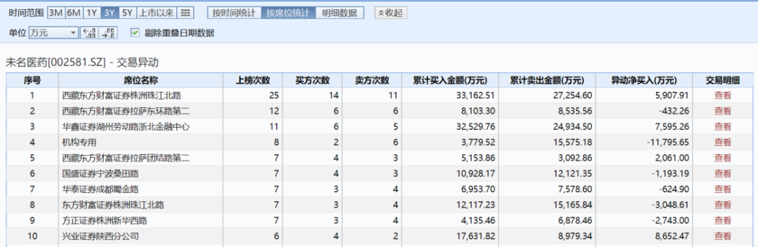 未名医药龙虎榜上榜席位统计