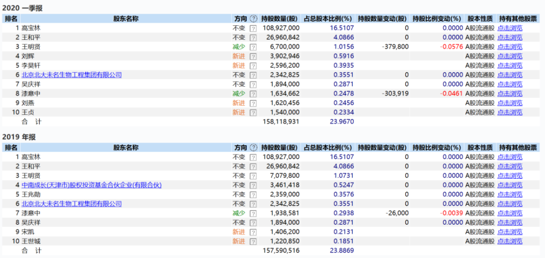 未名医药2019年报、2020年一季报十大流通股东榜单