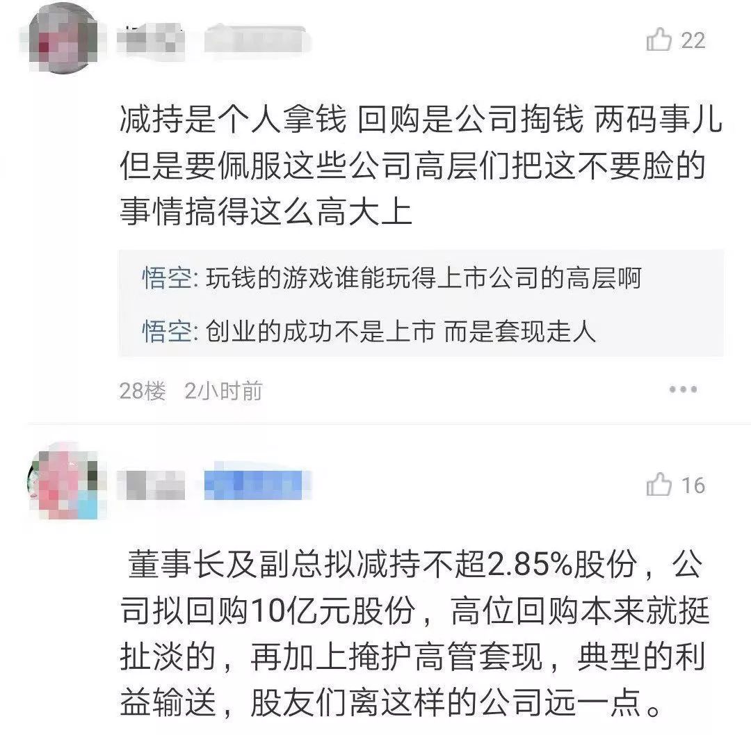 股民们当场就炸锅了,认为吃相太难看,有网友评论称,简单说就是拿公司钱给高管接盘,这样操作都行也是醉了,骗我都懒得骗了么?