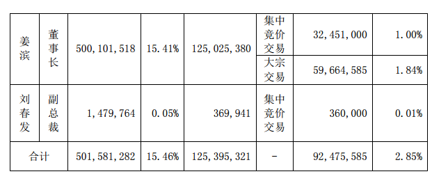 公告显示,董事长姜滨计划自减持计划公告之日起十五个交易日后的六个月内以集中竞价方式减持本公司股份32,451,000股(不超过本公司总股本比例1.00%);姜滨先生计划以大宗交易方式转让本公司股份59,664,585股(占公司总股本的比例1.84%),受让方为一致行动人公司总裁姜龙先生;刘春发先生计划自减持计划公告之日起十五个交易日后的六个月内以集中竞价方式减持本公司股份360,000股(占本公司总股本比例0.01%)。