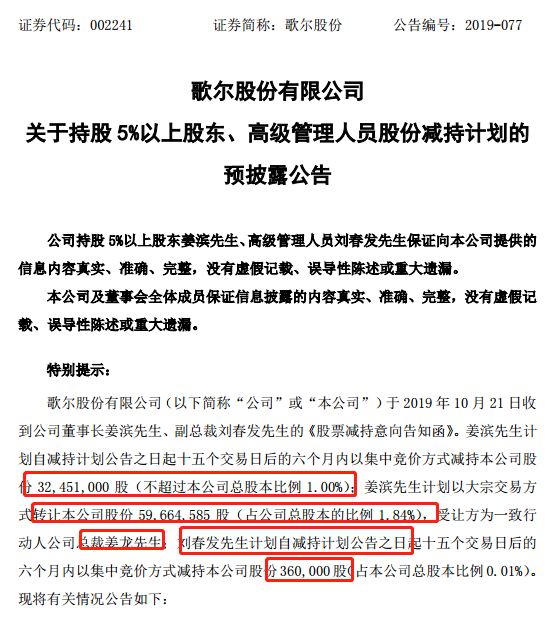 本来这是一份利好,结果同一时间,歌尔股份的董事长反手就要减持,公告称董事长跟副总裁要减持,占总股本的2.85%,按照21日的收盘价18.27元/股计算,套现接近17亿元。
