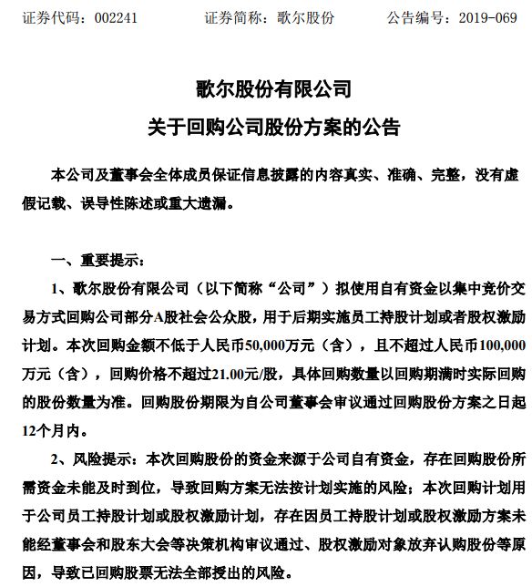 10月21日晚间,歌尔股份发布了几份公告,其中一份公告了回购股份,金额在5亿至10亿元之间,回购价格不超过21.00元/股。