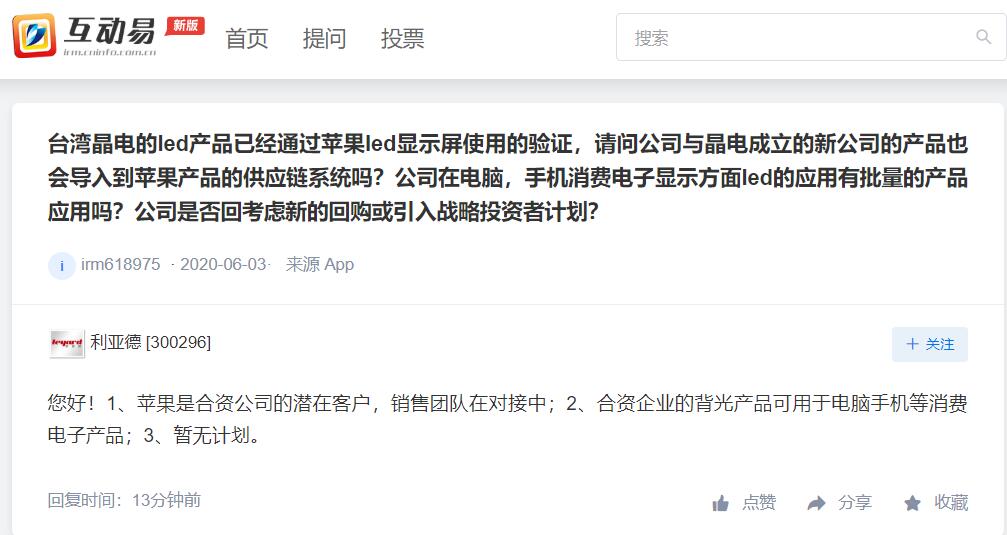 利亚德:苹果是合资公司的潜在客户 正对接中