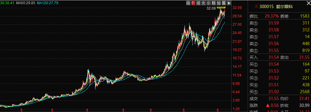 公开资料显示,登陆A股近10年间,凭借其迅猛的发展速度和良好的财务业绩,爱尔眼科迅速崛起为A股市场的明星公司,其市值也从最初的不足70亿到目前接近千亿市值,目前名列创业板市值规模前三。