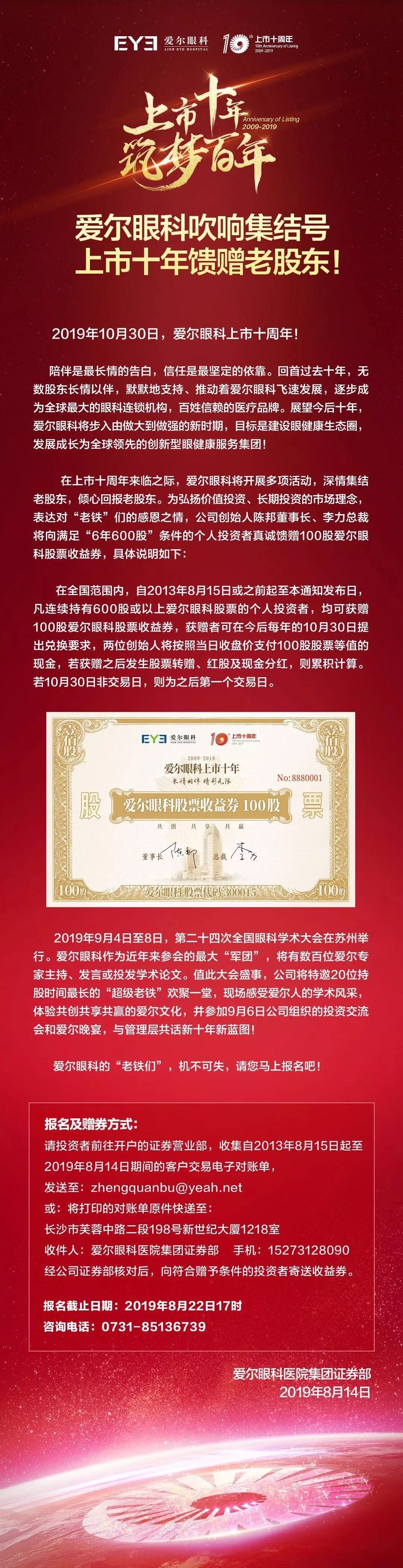 爱尔眼科(300015)上市十周年庆生方式是给长期持有公司股票的“老铁”们赠送“股票”。