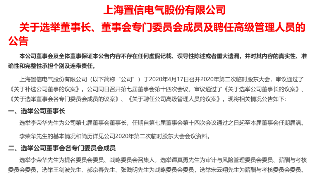 与此同时,置信电气还选举产生了新一任董事长及董事会专门委员会成员,并聘任了包括总经理、副总经理兼总会计师、副总经理在内的4名高管。