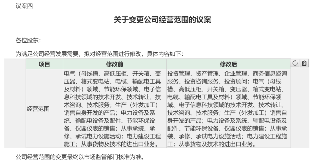 与此同时,该公司的经营范围也在原来的基础上,增加了“投资管理、资产管理、企业管理、商务信息咨询服务、投资咨询服务、投资顾问”等内容。