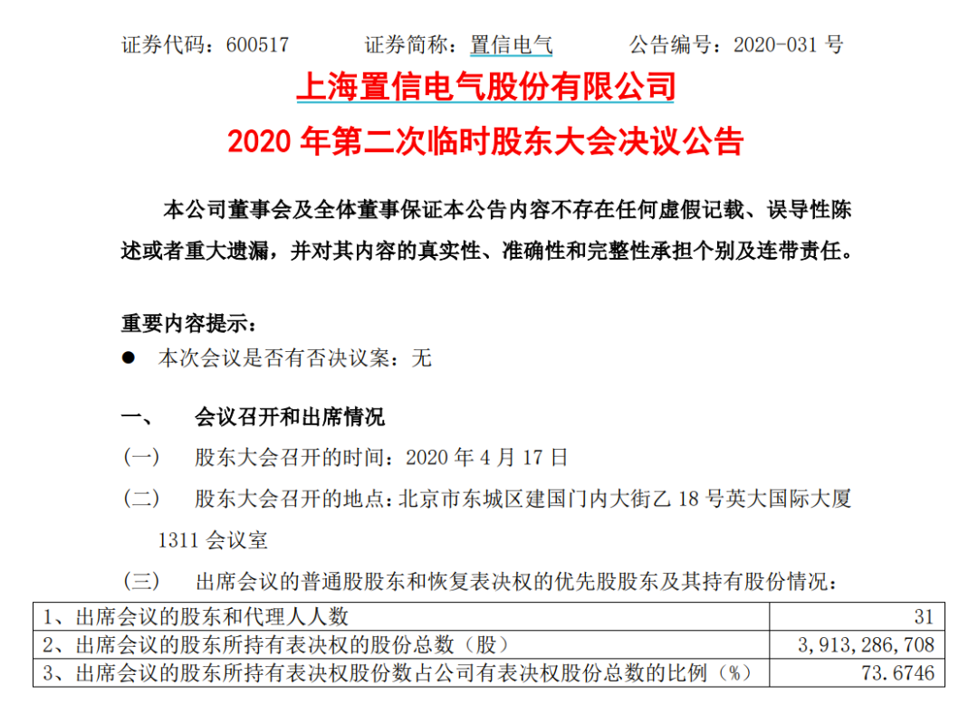 4月17日下午,置信电气召开2020年第二次临时股东大会,13个议案全部获得通过。