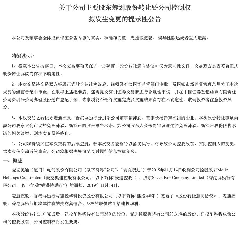 11月14日A股盘后,麦克奥迪发布了一份《关于公司主要股东筹划股份转让暨公司控制权拟发生变更的提示性公告》。