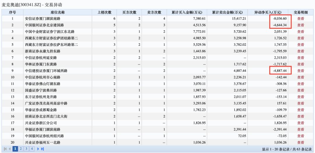 Wind龙虎榜显示,自11月15日以来,麦克奥迪连续8次出现交易异动,而上榜的买卖前五席均为券商营业部,未有机构现身。按照席位统计,共有63家营业部上榜,上榜超2次的有16家。