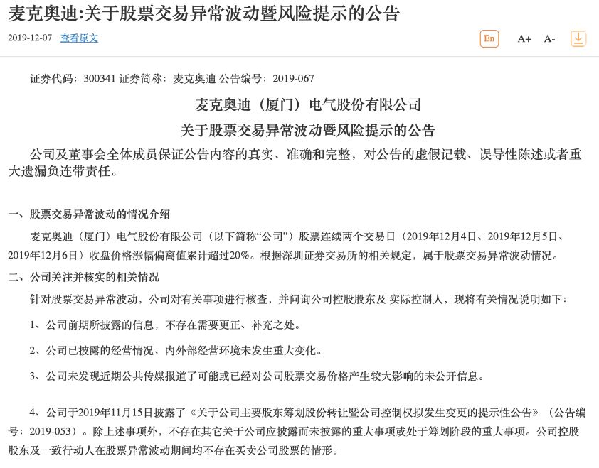 公告称,麦克奥迪(厦门)电气股份有限公司股票连续两个交易日(2019年12月4日、12月5日、12月6日)收盘价格涨幅偏离值累计超过20%,属于股票交易异常波动情况。