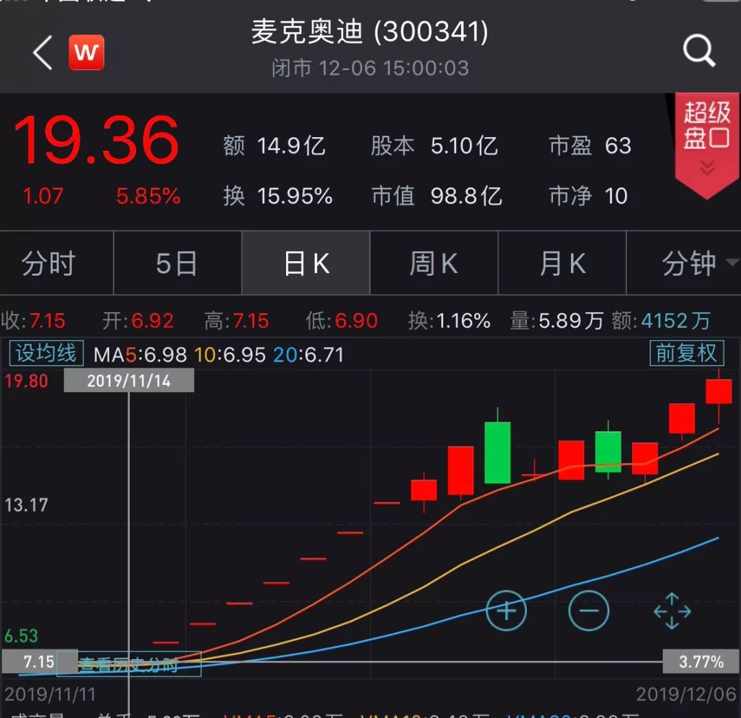 11月13日,麦克奥迪的收盘价报6.89元/股,而至12月6日最新收盘价19.36元/股,区间涨幅超180%,仅次于11月18日刚刚上市还未开板新股指南针,可谓“牛冠A股”。