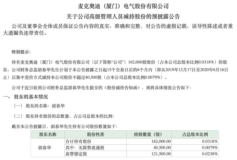 11月25日,麦克奥迪发布高管减持预披露公告,称公司财务总监胡春华计划在15个交易日后的6个月内以集中竞价方式减持不超过4.05万股,减持原因为个人资金周转需要。据披露,胡春华持有16.2万股,占比0.0318%。