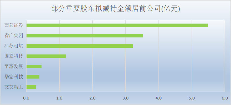 11家公司中,西部证券重要股东拟减持金额最高,其持股5%以上股东上海城投控股股份有限公司计划于6月18日至12月31日,在股价不低于9元的情况下减持不超过7000万股公司股份,占总股本的2%,拟减持金额不低于6.3亿元。
