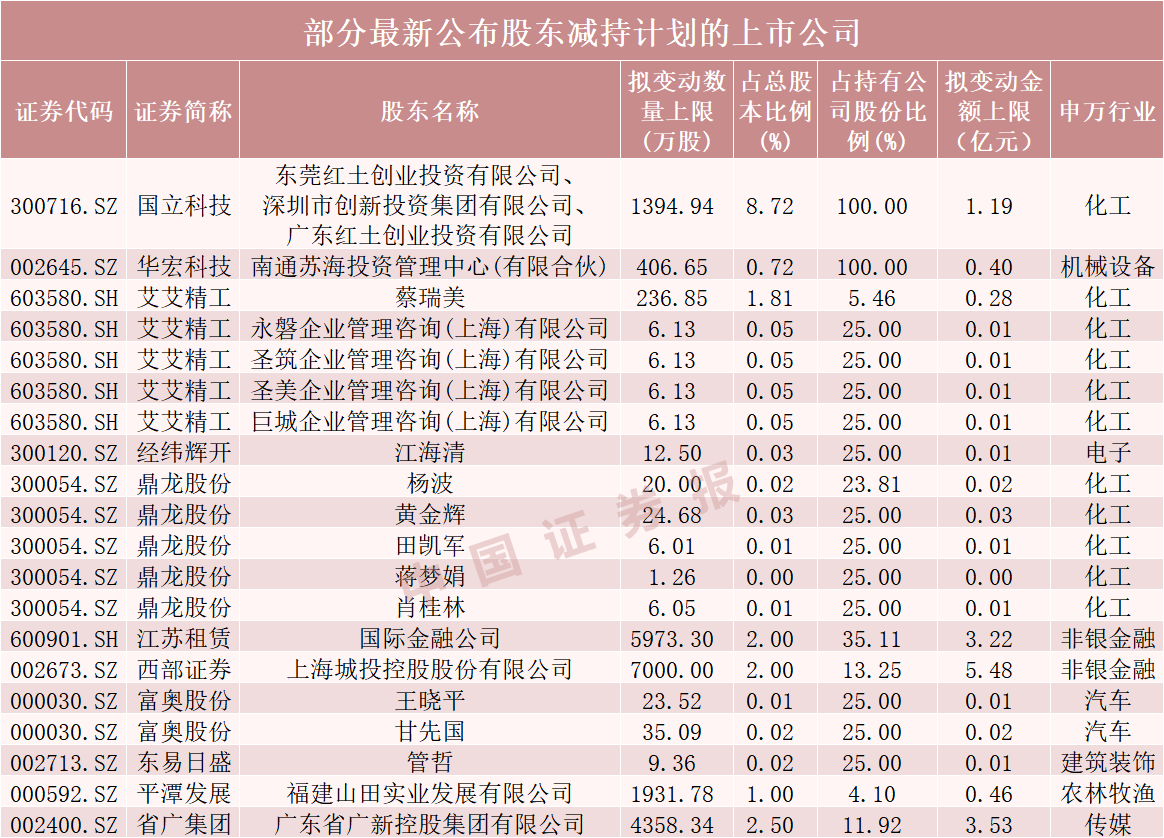 值得注意的是,国立科技股东东莞红土创业投资有限公司、深圳市创新投资集团有限公司、广东红土创业投资有限公司,华宏科技股东南通苏海投资管理中心(有限合伙),均拟减持其全部持股。