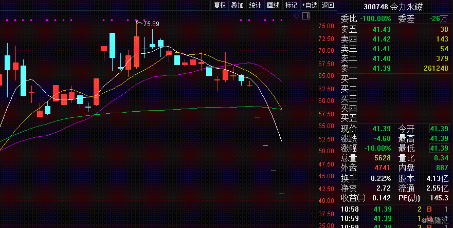 9月26日,稀土龙头金力永磁连续第四个交易日一字跌停,报价41.39元/股,成交额2257万元,开盘卖一封单高达26万手,换手率仅0.21%。