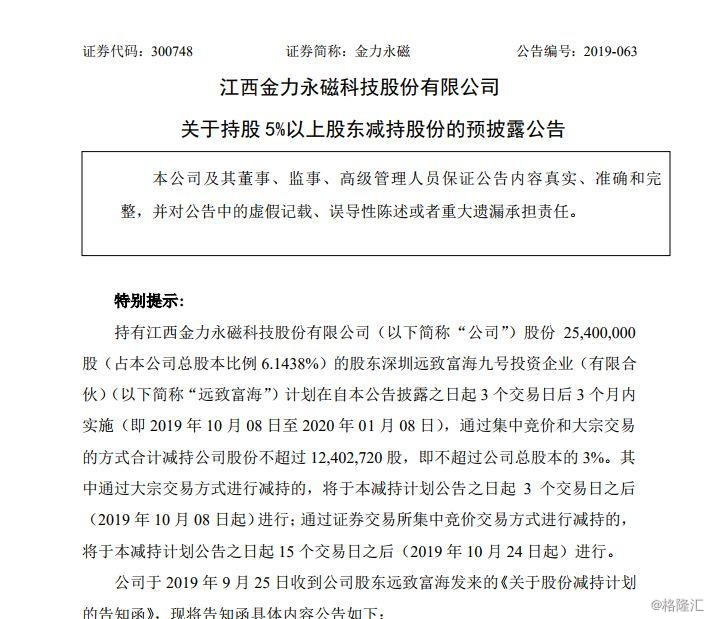 金力永磁9月25日晚间发布公告,持股6.14%的股东远致富海计划在2019年10月8日至2020年1月8日,通过集中竞价和大宗交易的方式合计减持公司股份不超过1240.27万股,即不超过公司总股本的3%。