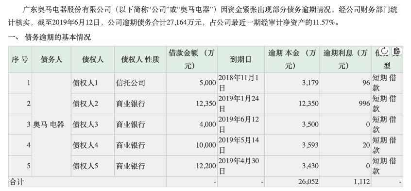 债务逾期公告显示,截至2019年6月12日,奥马电器已经有合计2.72亿元的债务出现逾期,占最近一期经审计净资产的11.57%。