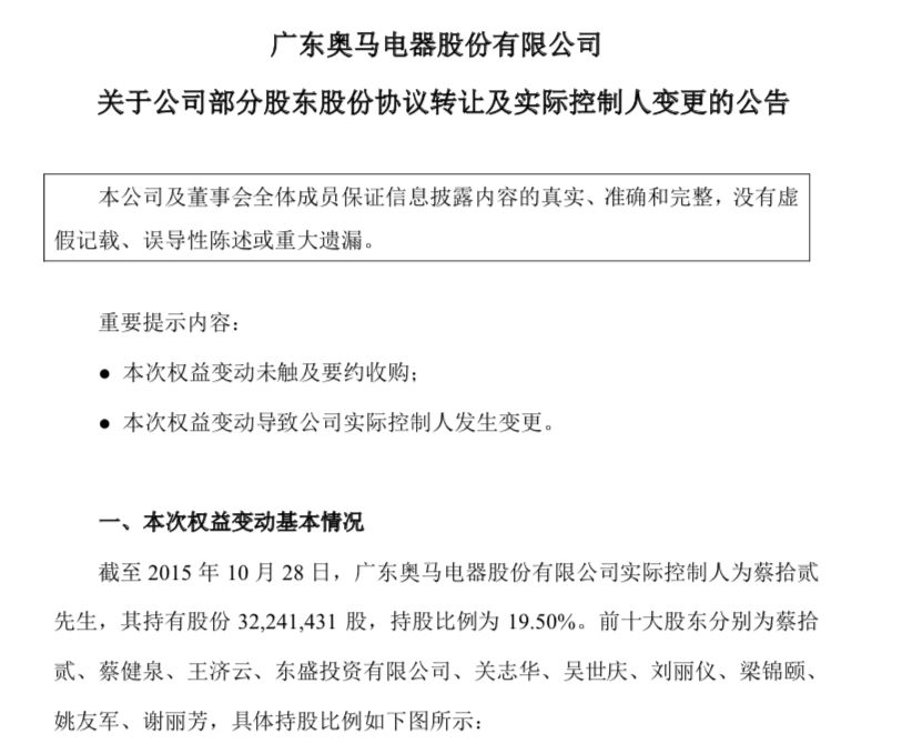 2015年10月30日,奥马电器公布股权转让方案。曾任京东副总裁的赵国栋以12.13亿元受让奥马电器创始人蔡拾贰等8名股东转让的3370万股股份,以20.38%的股权占比成为第一大股东和实际控制人。