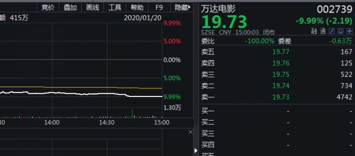 此外,20日早间开盘后,万达电影大幅杀跌。截至收盘,共有4742手卖单封住跌停。