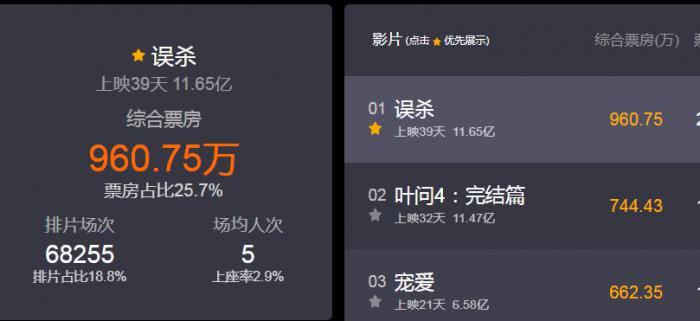 来自猫眼的数据显示,截至1月20日17:08,电影《误杀》上映39天的时间里,合计取得总票房11.65亿元。