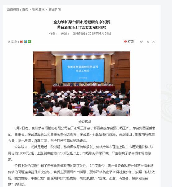 根据茅台集团官网消息,8月7日晚,贵州茅台还专门召开了市场工作会,会上李保芳开门见山地说:“今天是为价格而开会。”“要控制价格,而不是稳住价格。”李保芳还强调,茅台酒价格是不可以随便动的,我们一定要保持定力和底气。