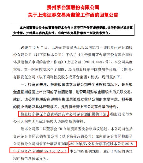 在对上交所监管函的回复中,贵州茅台明确,控股股东并无全盘直销经营本公司茅台酒配额的计划,控股股东与本公司之间亦无形成金额较大关联交易的安排。